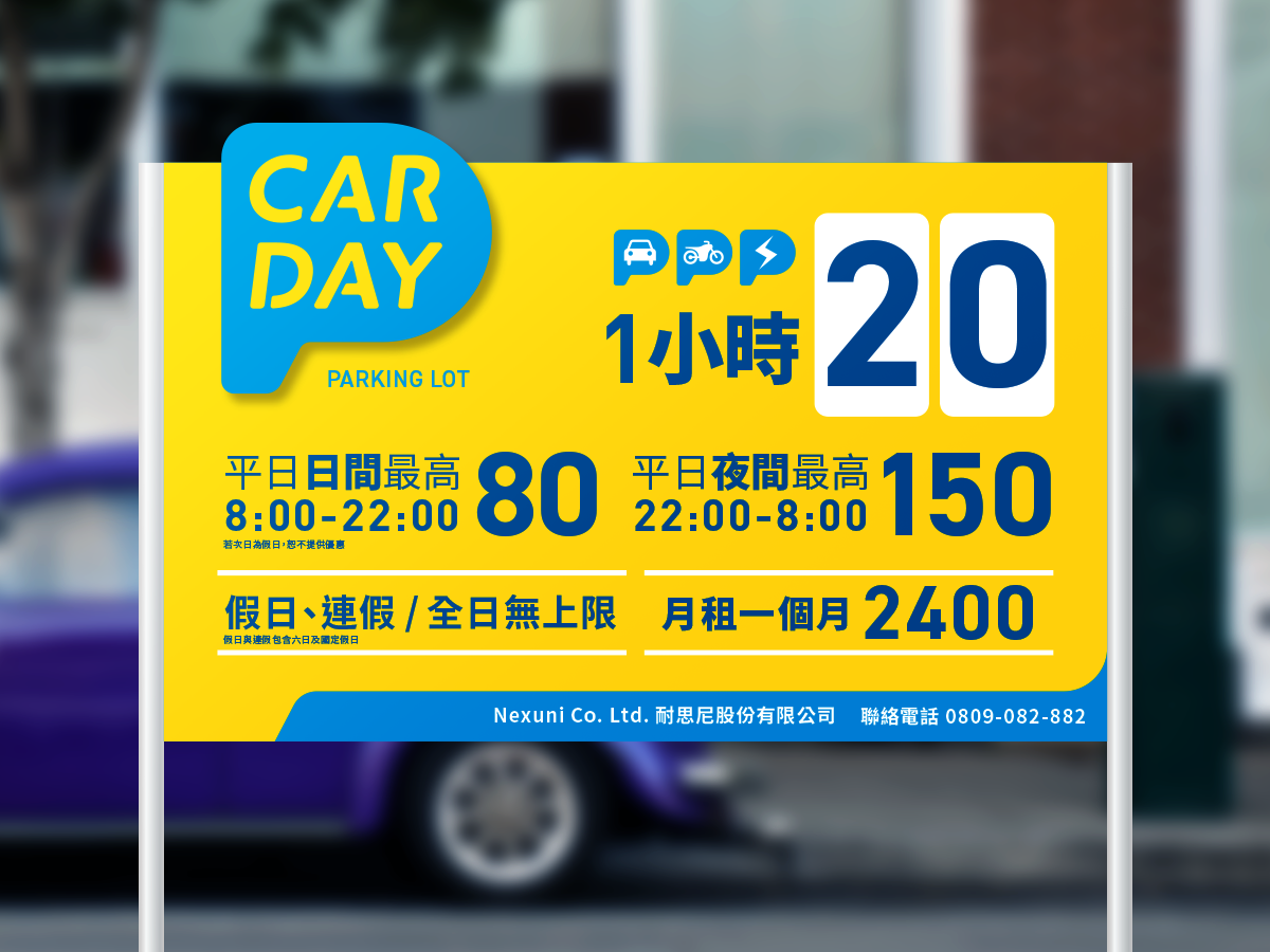 負責為智慧解決方案新創公司Nexuni旗下的停車場子品牌“CarDay天天停車” 發想品牌概念,同時規劃品牌溝通策略並設計logo與識別。另外,MX也依據品牌視覺延伸設計一系列的停車場內相關製作物及其他應用設計物。