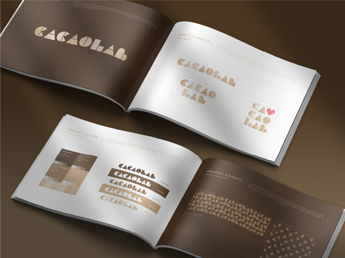 首先,我們以巧克力的造型形狀為靈感設計了主logo去呈現cacaolab的英文字母,加上金黃色調的奢華感,突顯出品牌的精緻和獨特性。其次,我們負責規劃CI guide,提供了品牌的顏色、字型、樣式等設計指引,確保品牌識別在各種應用場景下保持一致和專業性。同時,我們設計了可以應用於包裝、店內裝潢等處的brand pattern,這些圖案充滿了巧克力的幾何元素,營造出溫馨享用甜點的氛圍,與品牌形象相呼應。除此之外,我們還設計了其他品牌logo相關應用設計物,包括名片、袋子、帽子等,這些物品都印有品牌logo和品牌元素,能夠有效地提升品牌的曝光度和識別度。