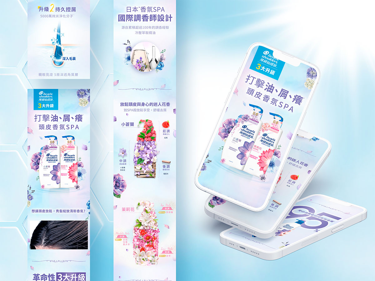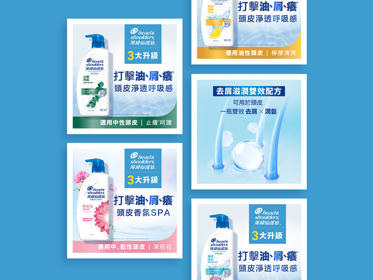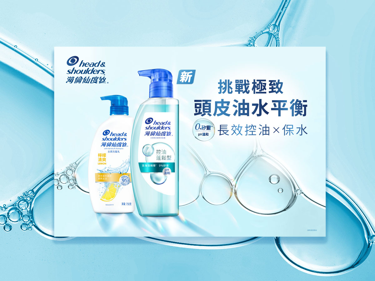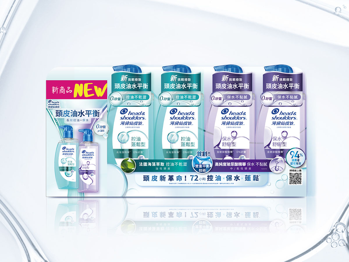 2023年度海倫仙度絲推出全新產品線「頭皮護理 油水平衡系列」,主打能夠解決頭皮油水失衡的問題,因此我們在主視覺設計上將「油水融合的泡泡」作為主要視覺概念,直觀地視覺意象讓消費者能很快理解本次產品的特點。另外MX也延伸此KV設計到全通路的輔銷物上,如貼紙、貨架、官網等等,維繫一致地品牌視覺形象,幫助此產品系列在台灣髮品市場銷售額創下佳績。