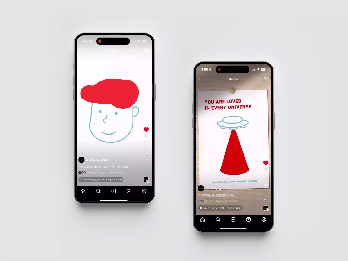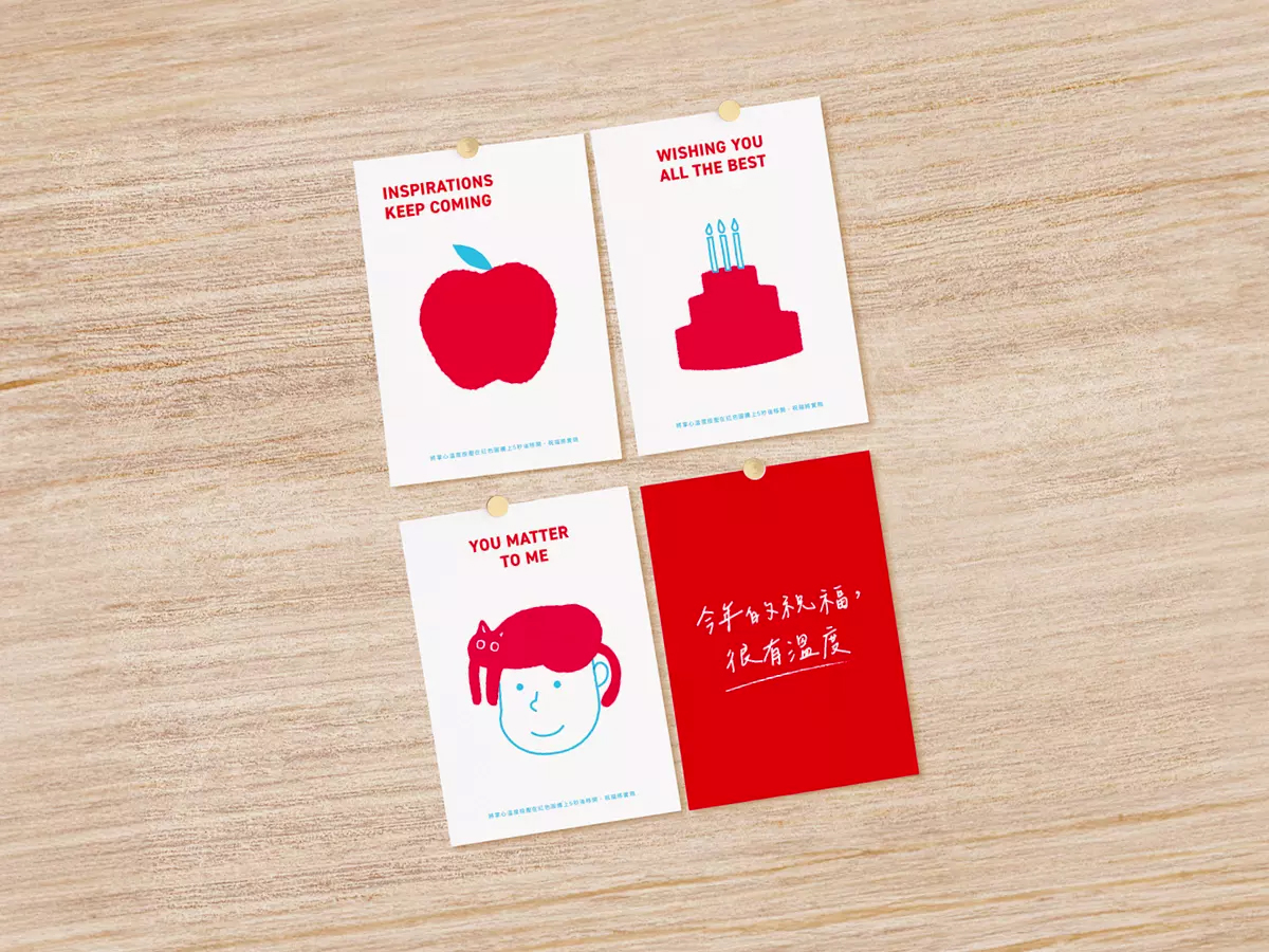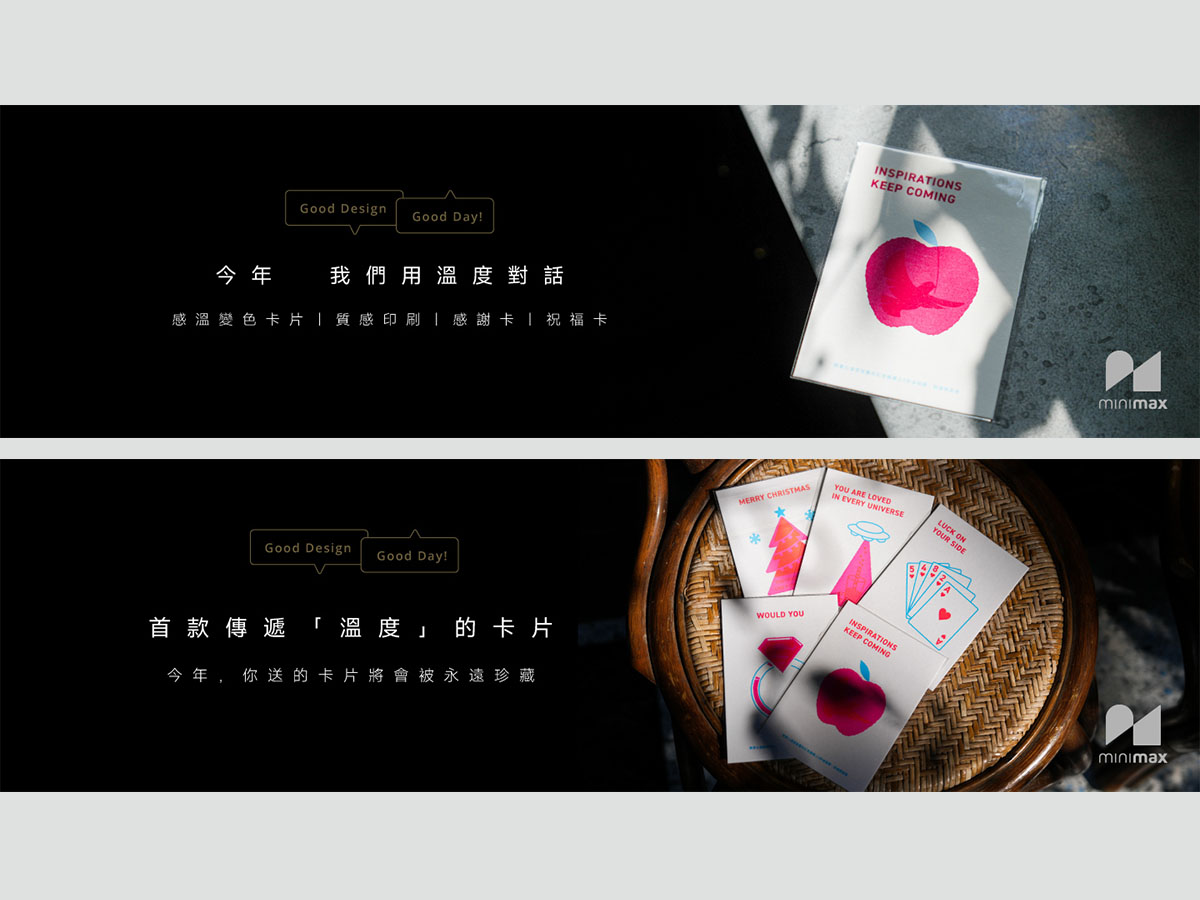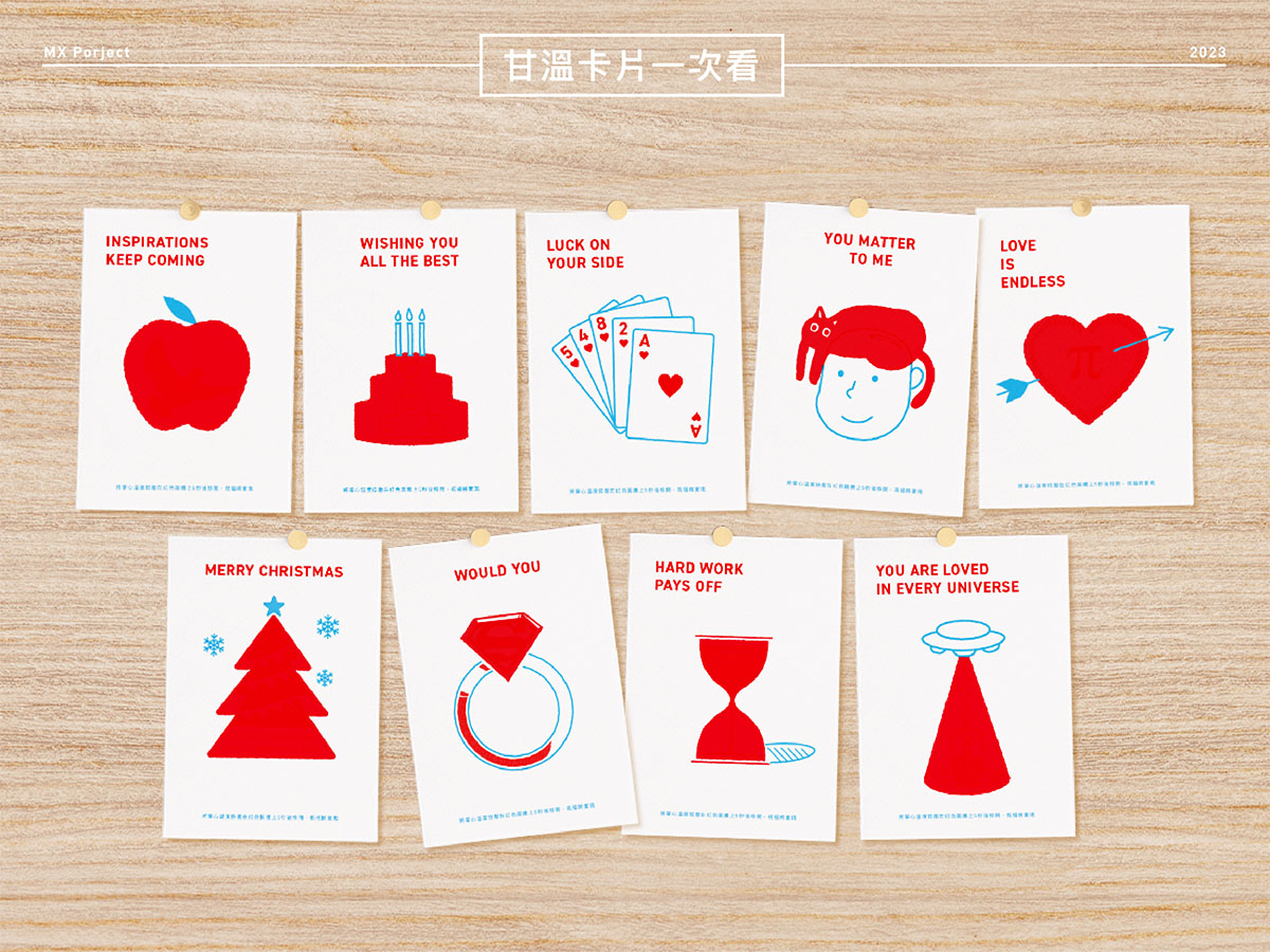 MX 因應年末節日及各種祝福場景,今年首度推出自行設計和製作的高品質感溫變色卡片,共有九款圖騰搭配對應的祝福語,同時打造『運用掌心溫度使圖騰變色,露出另外一組隱藏圖像』的機制增加互動性,使收禮者能充分感受溫暖心意的傳遞。MX 透過本次設計,展現設計師專業和發揮Mini 與 Max 的品牌精神,用一張感謝祝福卡埋藏許多小小的巧思,最終呈現出很巨大且深刻的感動。