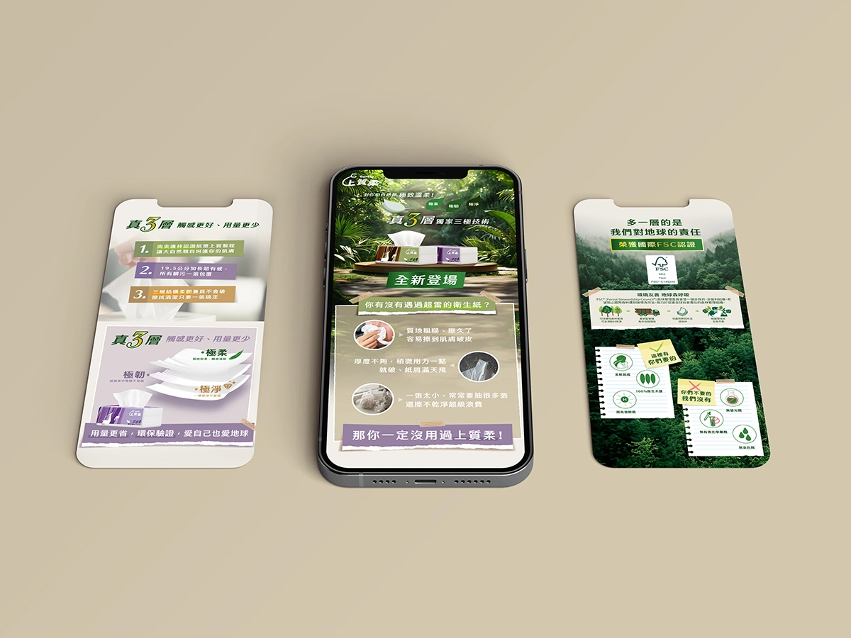 MX 在前期與客戶訪談中了解產品特色,在 客戶預算內將廣告效益極大化,創造獨特銷售賣點:獨家 3 極技術「極柔 極韌 極淨」,使產品特色清晰易懂,並幫助 Gentto 上質柔 成為一個受消費者歡迎和信任的新興衛生紙品牌。