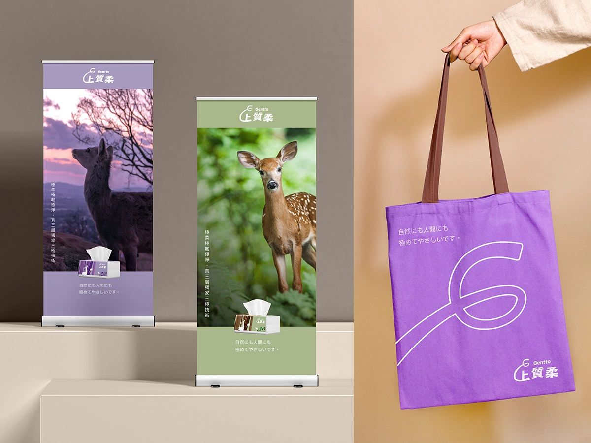 在這個家樂福全新的自有衛生紙品牌 「Gentto 上質柔」專案中。我們的工作涵蓋品牌命名、品牌定位到 Logo 設計,目標是在兩個月內為這個品牌打造出一套清晰且容易識別的形象。英文名「Gentto」音同「Gentle」代表使用這款柔軟的衛生紙產品時,就像被一雙溫柔的手撫觸,中文名中包含了「上質じょうしつ」,這在日文中有著「高品質、優質」的意思,突顯了產品的卓越品質。品牌的定位也圍繞著這個核心價值,讓消費者一看就能感受到產品的高質感。