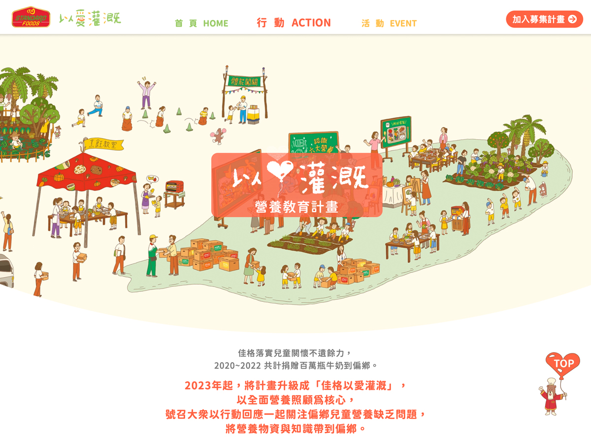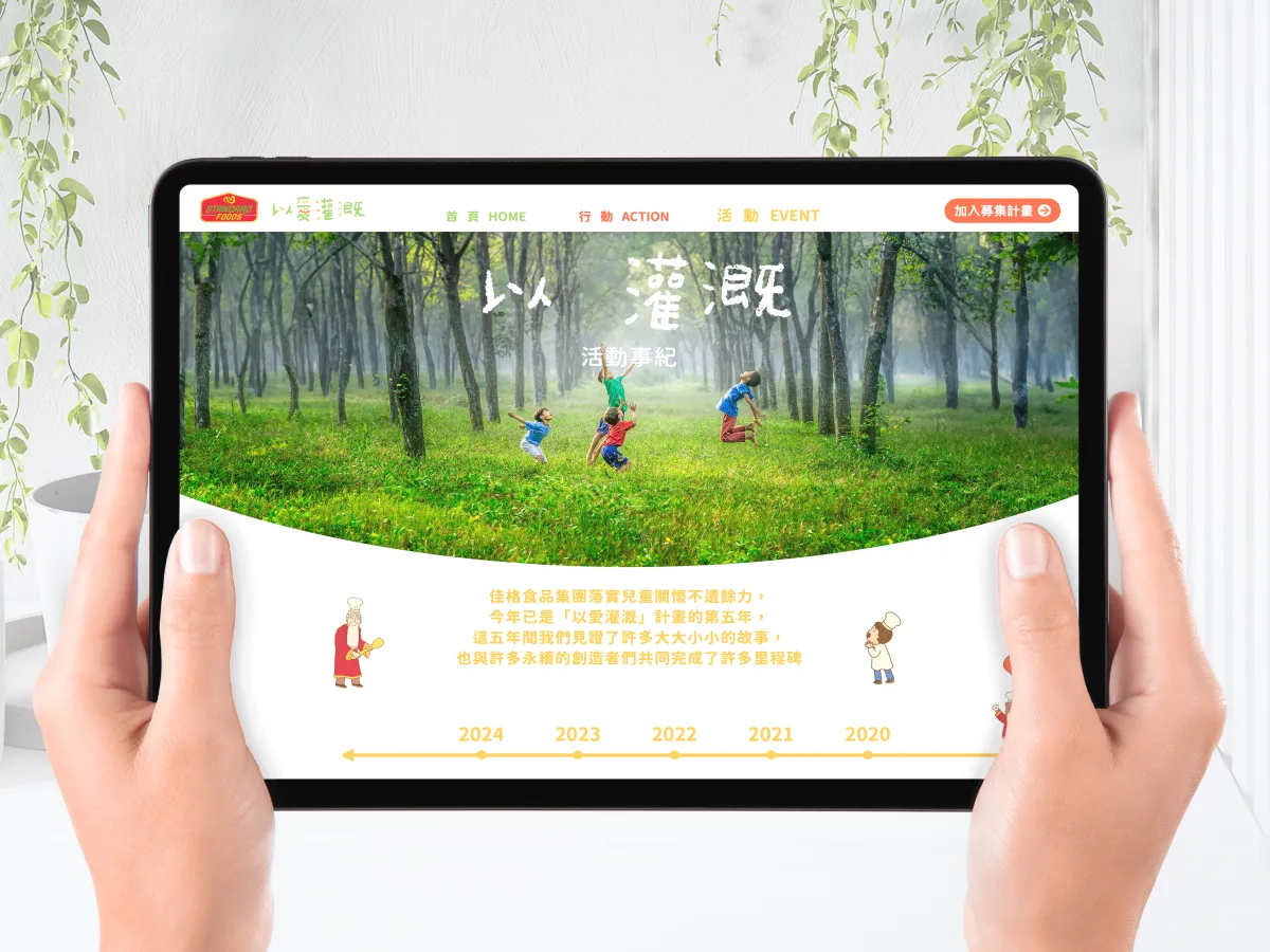 佳格食品集團旗下有桂格、天地合補、福樂等知名品牌,公司名稱意喻著將以高標準、高規格,生產品質優良且符合台灣人營養健康需求的產品。MX 此次協助佳格的ESG Team 所推廣的公益活動「以愛灌溉」進行活動網站整體架構規劃與創意設計。此活動以「偏鄉孩童全面營養照顧」為核心,致力於打造更好的偏鄉營養教育環境。MX 透過前期與客戶的深度討論,了解此活動之脈絡後,進行網站架構規劃。